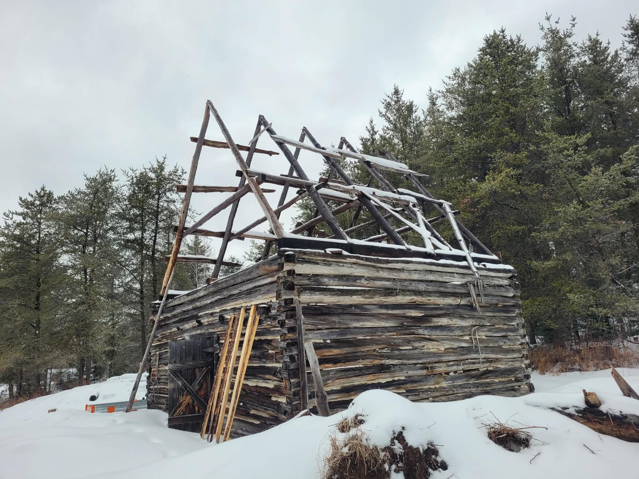 La structure du bâtiment est entièrement construite d’arbres du territoire de Terre Sauvage. Écorçés et rabotés selon les techniques ancestrales, installés à force d’homme et fixés selon les techniques ancestrales